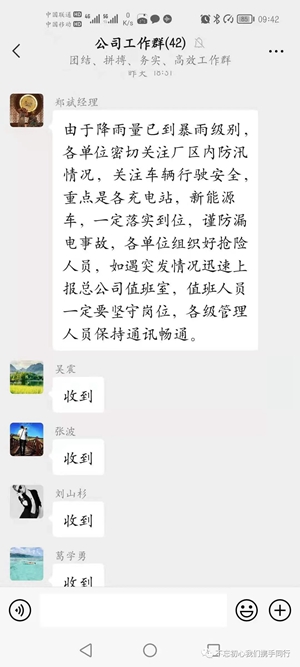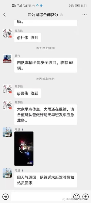 一是信息共享??偣就ㄟ^微信群、車內(nèi)監(jiān)控、GPS定位等手段,及時(shí)將線路運(yùn)行情況、危險(xiǎn)路段道路積水情況、場站排水情況等信息進(jìn)行共享聯(lián)動,以確保及時(shí)準(zhǔn)確下達(dá)工作指令。