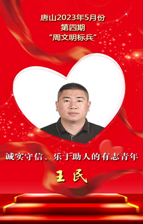 日前,唐山市“文明標(biāo)兵”評選發(fā)布組委會(huì)辦公室公布了2023年5月份第四期“周文明標(biāo)兵”名單。他們是: