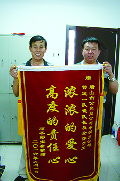 9月1日上午,鄭先生特意制作了兩面錦旗,來到豐潤區(qū)車場分別對物業(yè)站職工拾金不昧、豐潤公司職工樂于助人、熱情服務(wù)表示感謝。鄭先生說:“我要為咱們公交職工的愛心與熱心點贊,你們太熱心,太熱情了。昨天我來車場時先后接觸了司機、路隊長、保安、物業(yè)站長和保潔員幾個崗位的工作人員,他們每個人都非常熱情、充滿愛心,更是樂于助人,言行中處處充滿著正能量,真的令我很感動!”