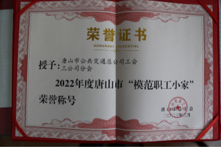 2023年3月,唐山交通發(fā)展集團公共交通總公司工會委員會榮獲2022年度“唐山市模范職工之家”稱號,唐山交通發(fā)展集團公共交通總公司工會三公司分會榮獲“唐山市模范職工小家”稱號,高亞男榮獲“唐山市優(yōu)秀工會積極分子”稱號。
