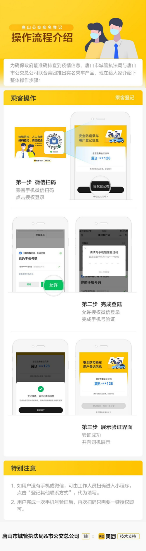 該實名制登記系統(tǒng)是唐山市城管執(zhí)法局、唐山公交總公司與美團公交合作開發(fā),已覆蓋所有公交車,實現(xiàn)了“一車一碼”。登記的相關(guān)信息使用專用服務(wù)器予以加密保存,既杜絕了登記信息泄露的風(fēng)險,又可有效減少因手工登記帶來的接觸風(fēng)險。在此倡議乘客朋友積極配合、文明乘車,有序排隊掃碼登記,請予理解和支持。