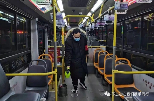 凌晨5:20,等待發(fā)車(chē)的我迎來(lái)幾張陌生面孔,莫不是新入職的駕駛員?原來(lái)他們暫時(shí)不能承擔(dān)駕駛員的工作,但是他們加入了防控的隊(duì)伍。為準(zhǔn)備上崗的駕駛員測(cè)量體溫,給運(yùn)營(yíng)車(chē)輛在出車(chē)前、收車(chē)后集中消殺通風(fēng),針對(duì)乘客易接觸的投幣箱、扶手、座椅等部位重點(diǎn)消毒,嚴(yán)格執(zhí)行一趟一通風(fēng)、一趟一消殺。老搭檔告訴我,只有接受消毒噴灑的洗禮,才能躋身抗擊疫情的行列。“來(lái)吧,我身經(jīng)百戰(zhàn),怎會(huì)退縮!”一切準(zhǔn)備完畢,出發(fā)。